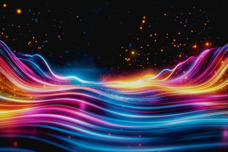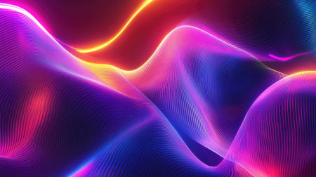 A stunning abstract landscape featuring vibrant neon light waves, creating a captivating visual experience. Ideal for technology and art themes.