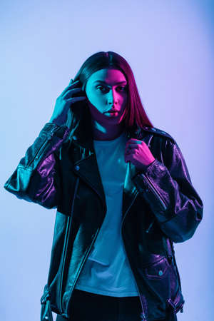 Cool pretty young woman model in fashion leather jacket poses in studio at blue pink colored lights. style girl