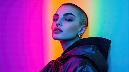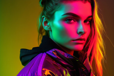 Portrait of a trendy young woman with bright clothing and bright neon lighting. Generative ai