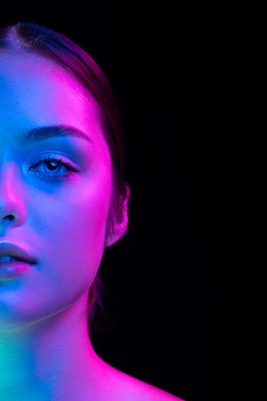 Fashion portrait of young beautiful woman in colorful neon light. Studio shot.
