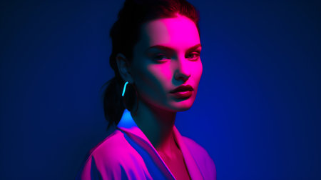 Portrait of a young woman in neon lights posing stylishly with vibrant pink and blue hues under ultraviolet lighting