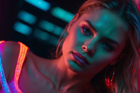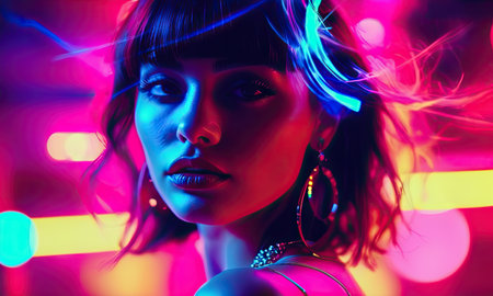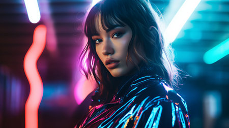 An AI generated illustration of a young female illuminated in the vibrant neon lights of a cityscape on a night time