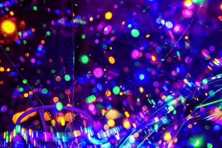 Abstract background of colorful lines in motion on black. Bokeh of defocused splashes, blurred red and blue neon leds, fireworks and salute, space and sky backdrop
