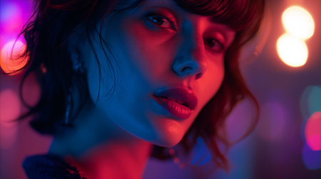 Portrait of a woman with soft features and neon red and blue lighting, surrounded by bokeh and shadows