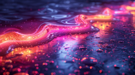 Pink showing close-up macro view of viscous liquid with embedded neon light streaks in blue green orange and pink colors keywords: abstract, liquid, neon, light,...