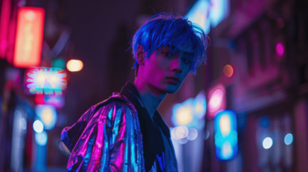 Completely blurred image young man with blue hair wearing a reflective jacket, posing in a city at night with neon lights creating a colorful backdrop. AI generation