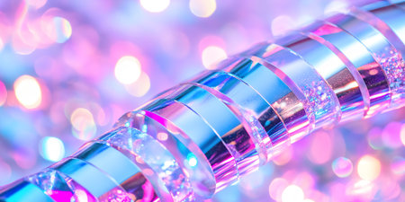 Shiny silver metallic spiral with pink and blue bokeh background.