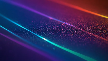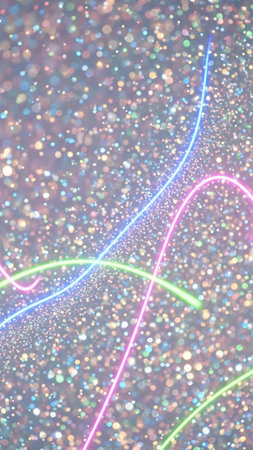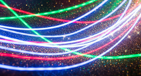 An abstract background filled with shimmering bokeh lights and vibrant neon light trails in blue, pink, and green.