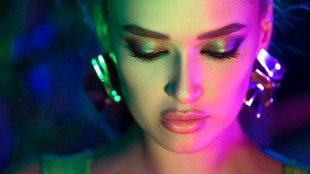 Beautiful young woman dancing and making party with fluorescent painting on her face. Neon facial portraits