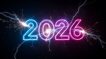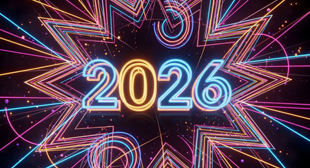 The year 2026 is creatively depicted with sparkling fireworks, surrounded by a vibrant display of lights, capturing the essence of celebration and anticipation for the New Year
