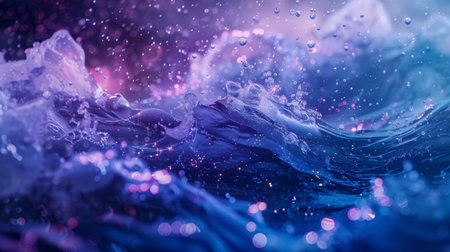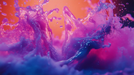 An abstract image capturing a splash of water with pink and purple lights. The dynamic and colorful composition is perfect for backgrounds, art, and creative projects.