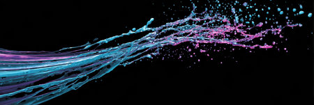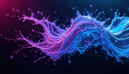 Close-up view of dynamic liquid splashes illuminated by vibrant neon purple and cyan lights. The fluid forms intricate shapes with translucent qualities, revealing tiny bubbles and droplets suspended in motion. The contrasting colors create an energetic and modern aesthetic, highlighting the fluid dynamics and abstract beauty of the liquid. The dark background emphasizes the glowing effect of the neon illumination.