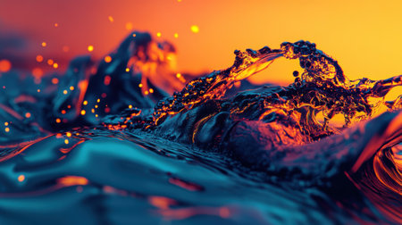 This stunning abstract image captures a vibrant splash of water illuminated by fiery orange and blue tones, showcasing dynamic movement and fluidity.