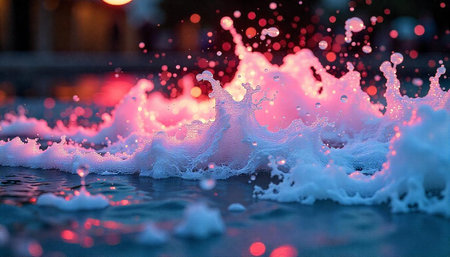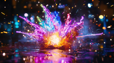 A stunning colorful explosion captures the energy and creativity of an urban night scene. Bright splashes of light and water create a mesmerizing visual spectacle, perfect for artistic projects.