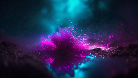 Water explosion with light in the middle, smoke and magic around. A pink purple blue soft focus background.poster concept.