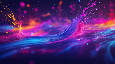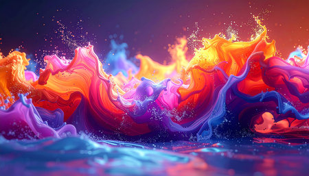 Vibrant splashes of water create an abstract visual with flowing colors and dynamic movement against a dark background.