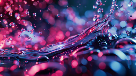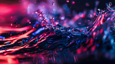Close-up of water splashing with vibrant neon lighting in red and blue hues. Perfect for abstract and creative themes.