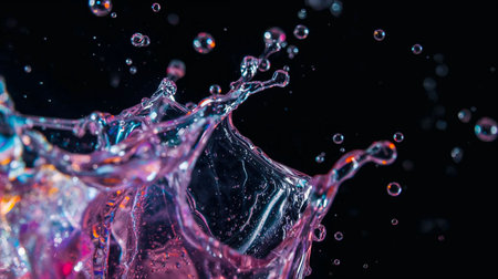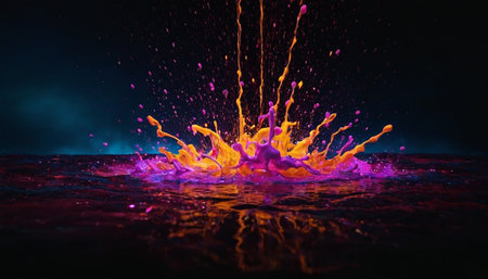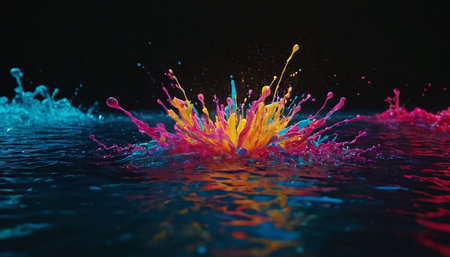 Water droplets burst into colorful splashes against a dark backdrop, creating a mesmerizing display of light and movement, evoking energy and dynamism.
