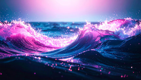 A neon-lit wave of dark water glows with blue, pink, and green light at sunset. Clear details and vibrant colo...