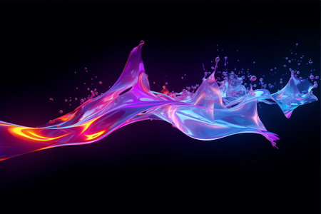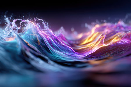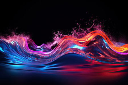 An abstract digital illustration showcases a flowing wave design, rendered in vibrant neon colors against a dark backdrop. The composition features dynamic lines and curves, creating a sense of movement and energy. Suitable for use in various visual communications, the design offers potential applications in modern design and technological projects.
