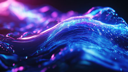 This stunning abstract image captures vibrant waves illuminated by glowing lights in shades of blue and purple, creating a mesmerizing visual scene.