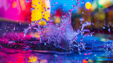 A stunning close-up image capturing a colorful water splash with vibrant hues. The light reflects off the droplets, creating an enchanting visual for artistic projects.