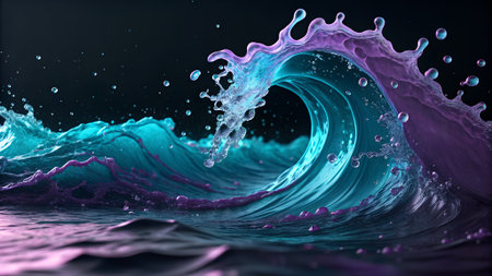 A dramatic, high-speed capture of a water splash, frozen in motion. The liquid is rendered with detail, showing translucent droplets and powerful wave-like crests. The scene is illuminated by vibrant neon purple and teal lights, casting a luminous glow on the water's surface and creating striking reflections. The dark background emphasizes the intensity of the splash and the glowing colors. This abstract representation of fluid dynamics evokes a sense of energy and power.