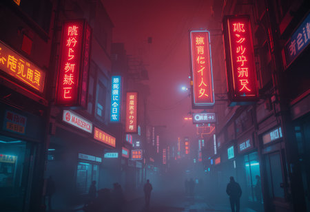 Urban showing neon lit foggy city street at night with glowing signs and wet reflections keywords: night, city,...