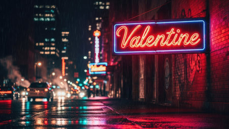 A neon sign displaying the word Valentine glows brightly against a brick wall in a nighttime urban setting. The scene features a wet street reflecting city lights, with blurred vehicle traffic adding motion. This image uses a cinematic style and is suitable for romantic themes, city life concepts, and commercial projects.