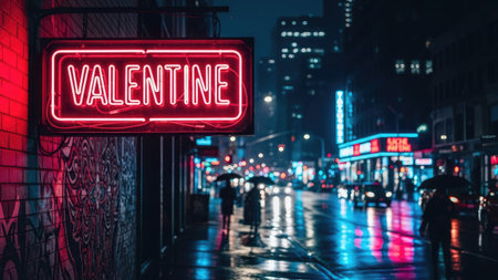 A vibrant neon sign reading 'VALENTINE' dominates the foreground, radiating a warm red glow. Rain-slicked streets reflect the city lights, creating a dynamic composition. The scene features silhouettes of pedestrians and vehicles. Suitable for various editorial and promotional purposes.