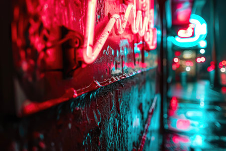 A brick wall with a pink hue and a blurry background. Neon lights. The wall appears to be wet and has a shiny, reflective surface. Scene is one of mystery and intrigue, as the blurry background