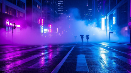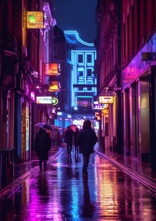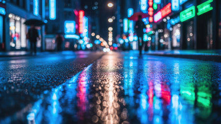 A nighttime cityscape scene presents vibrant neon lights reflecting on a wet street surface. The composition features blurred figures walking under umbrellas, enhancing the depth of field. This image is characterized by cool tones and soft lighting, suitable for various editorial and commercial applications.