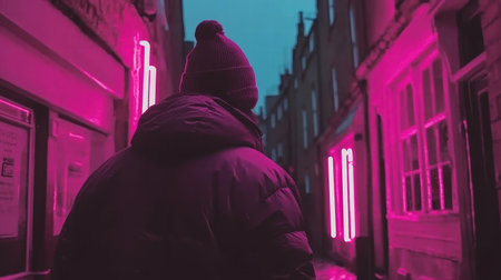 A solitary figure in a dark jacket walks through a narrow urban alley, illuminated by vibrant pink neon lights, creating a striking contrast at dusk.