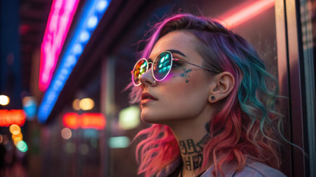A portrait of a young woman with bright hair and unique facial tattoos adorned with bold oversized glasses that reflect dazzling neon lights. The soft illumination casts gentle.