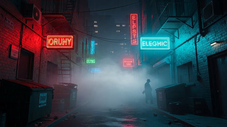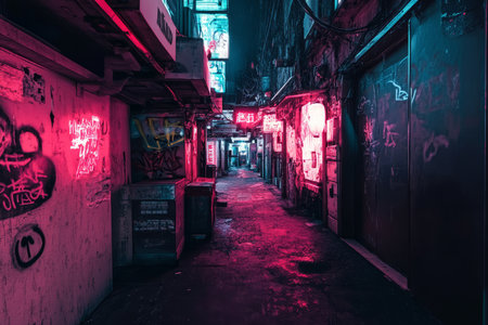 neon lit alleyway with glowing signs and holographic displays creating a vivid contrast against the dark backdrop Generative AI