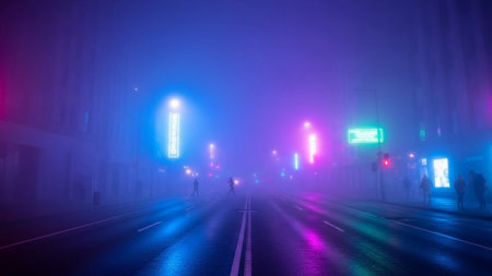 City showing neon city street at night through dense fog with silhouettes of people and traffic lights.