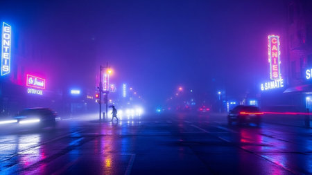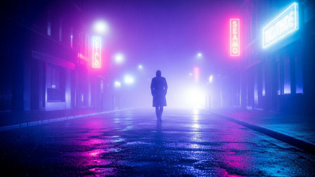 A lone figure in a trench coat walks down a wet, neon-lit city street shrouded in fog at night, with vibrant purple...