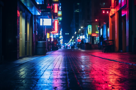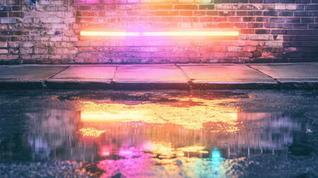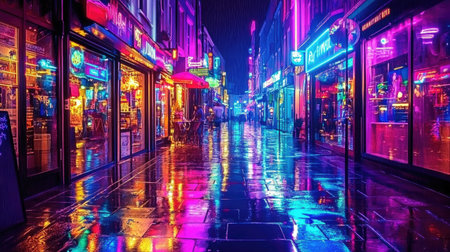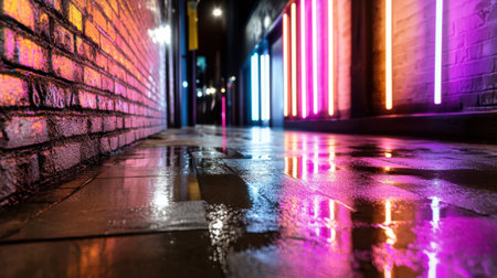 This captivating urban scene showcases colorful neon lights illuminating a wet pavement, reflecting a vibrant atmosphere in a serene nighttime setting.
