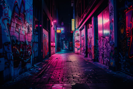 Dark alleyway with graffiti art. Underground city street with wall covered with graffiti in neon lights