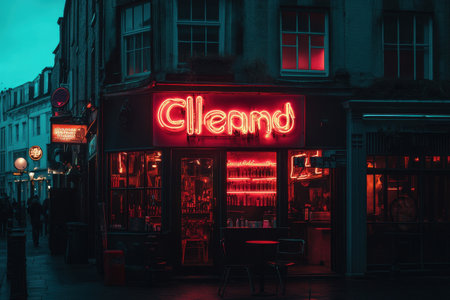 A vibrant neon sign illuminates a quiet street at night, showcasing urban atmosphere and solitude.