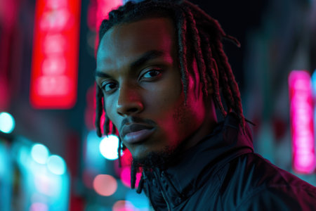 Thoughtful young man with dreadlocks in colorful lighting