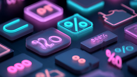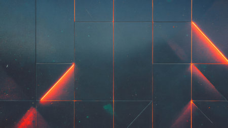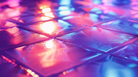 This image showcases a grid of dark squares illuminated by vibrant blue and pink neon light. The composition features a perspective view, highlighting the geometric pattern. The style is modern, with a focus on color and texture, suitable for various design projects and digital art applications.