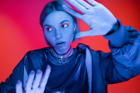 young woman in neon makeup looking away while posing with outstretched hands on coral red background