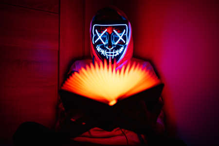 Man in glowing mask sitting in the corner with book-shaped lamp