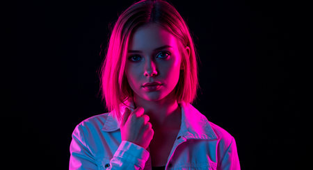 A captivating portrait of a young woman set against a backdrop of vibrant neon lights, showcasing urban nightlife and a colorful atmosphere in the city.
