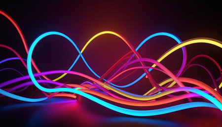 An abstract digital illustration showcases a flowing wave design, rendered in vibrant neon colors against a dark backdrop. The composition features dynamic lines and curves, creating a sense of movement and energy. Suitable for use in various visual communications, the design offers potential applications in modern design and technological projects.