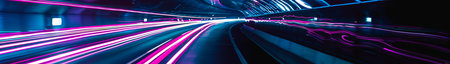Bright neon light trails sweep across a curved road in a dark tunnel, creating a dynamic nighttime atmosphere.