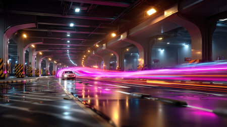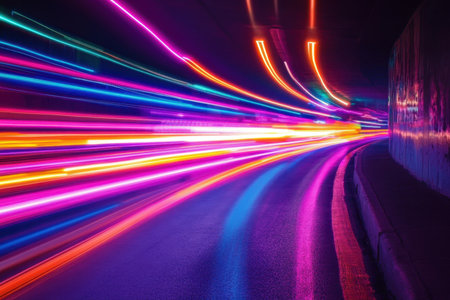 This captivating image showcases a tunnel illuminated by colorful neon lights, creating a dynamic and energetic atmosphere at night. The light trails symbolize motion and speed, reflecting creativity in urban design.