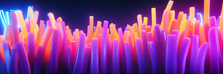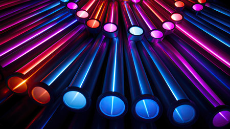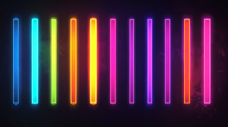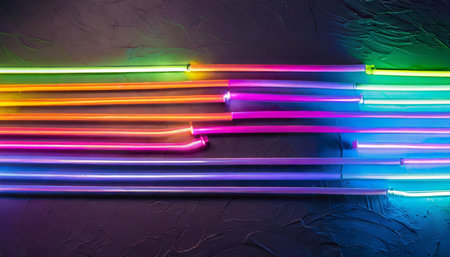 A captivating arrangement of neon tubes glowing in vivid colors set against a dark surface. Ideal for creative projects, artistic displays, and modern designs.