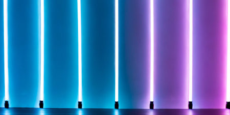 Colorful neon lights with vertical lines create a tech inspired abstract background in dark studio